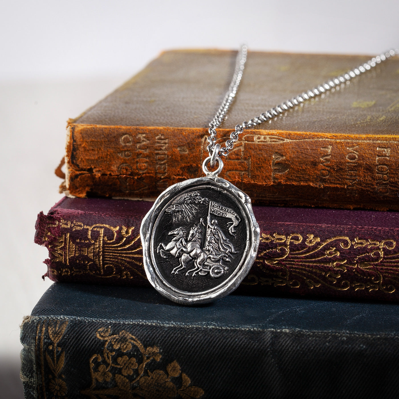 Celebrating a triumphant milestone in the fight for equality, this talisman — designed in collaboration with the British Museum — features a chariot carrying Justice, holding a flag that reads 'Votes For Women' in one hand and scales in the other.