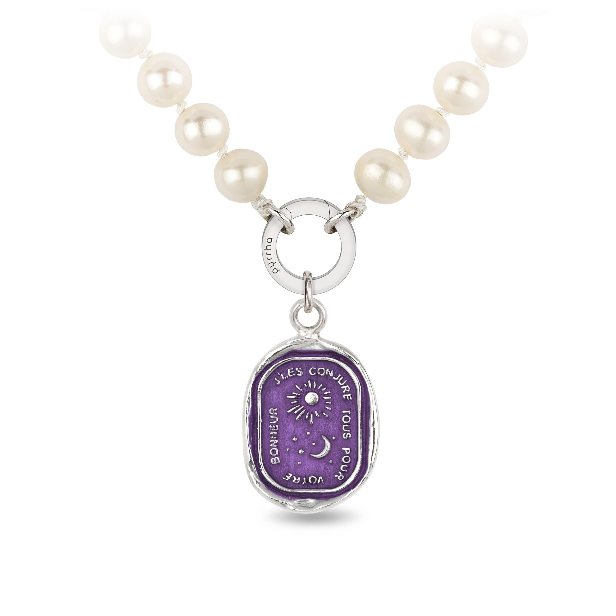 This talisman reads'J'les Conjure Tous Pour Votre Bonheur' in French, meaning 'I Conjure Them All for Your Happiness.' The sun, moon and stars represent love without limits.