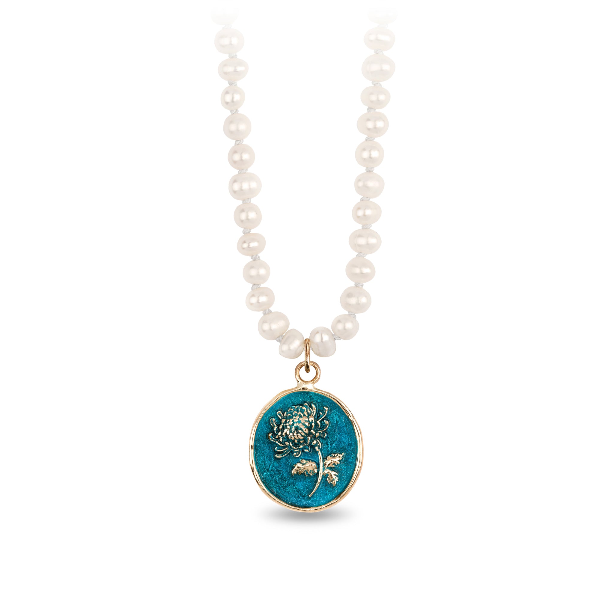- 14k gold talisman on knotted freshwater pearls