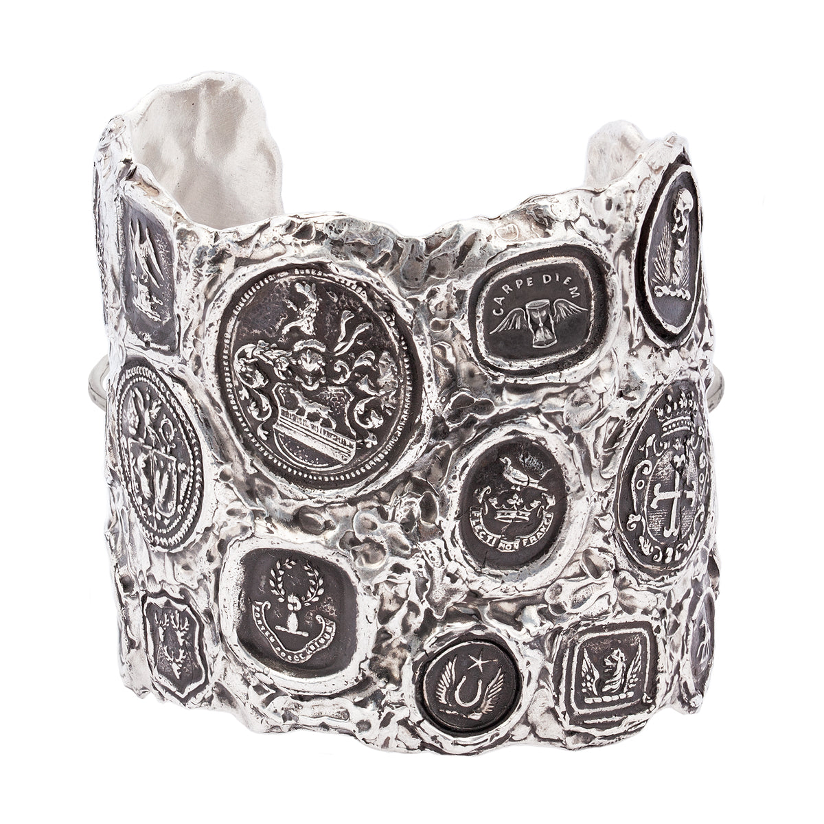 - Multiple sterling silver talismans formed into a wide cuff