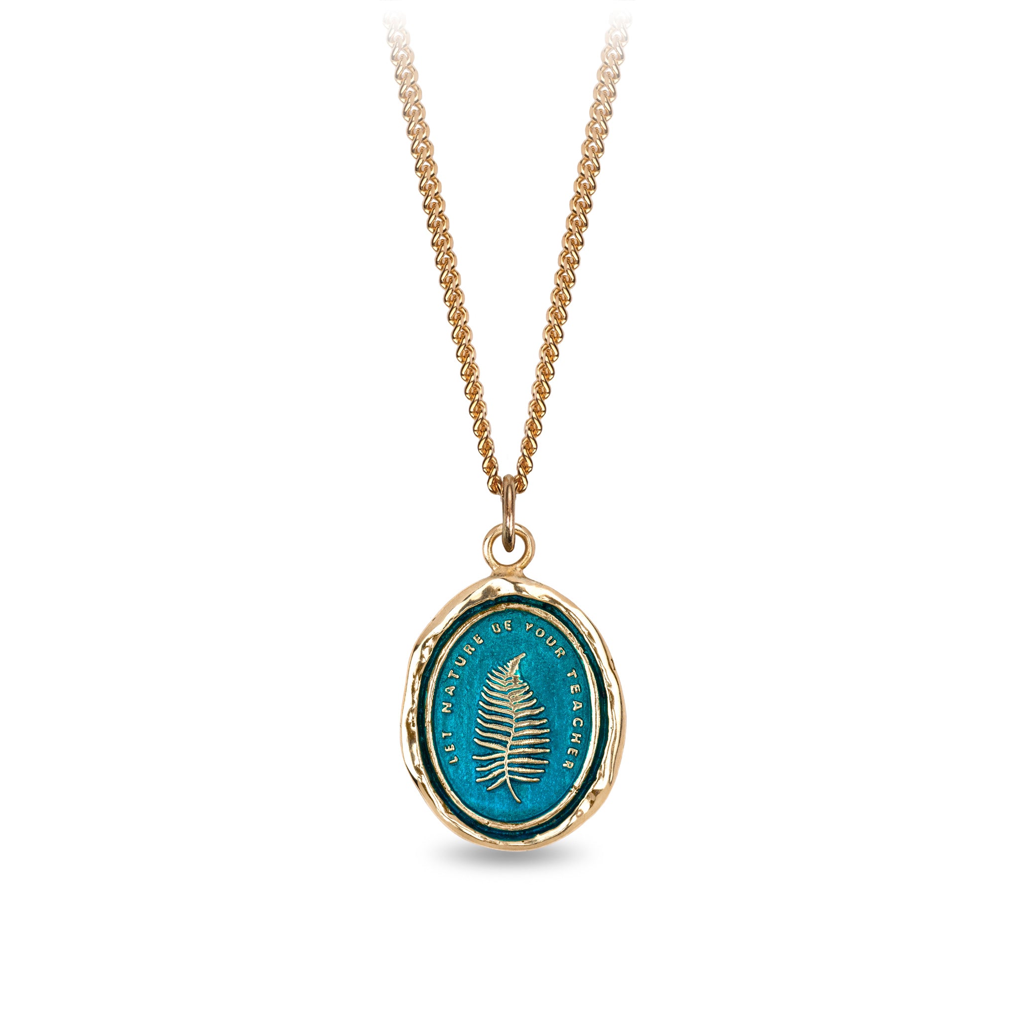 This talisman reads 'Let Nature Be Your Teacher.' A symbol of happiness, the fern frond represents the ability of the natural world to feed our souls.