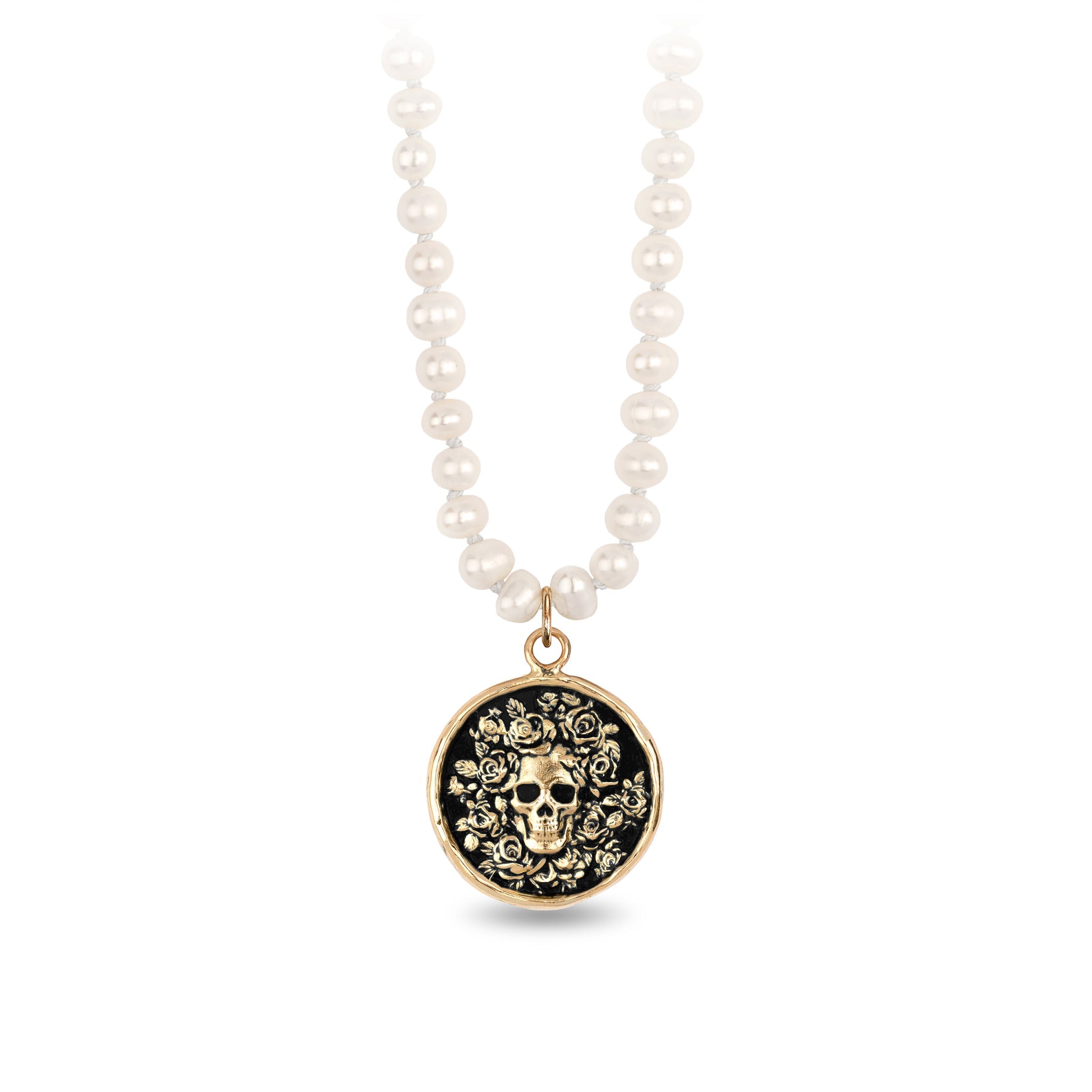 - 14k gold talisman on knotted freshwater pearls