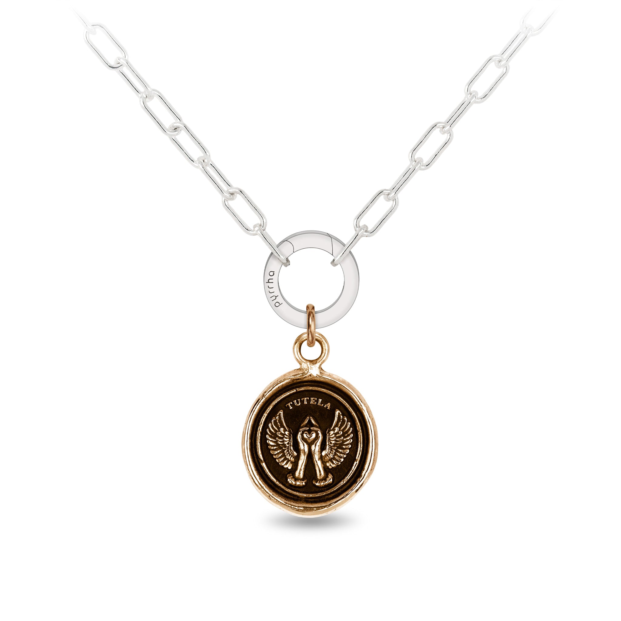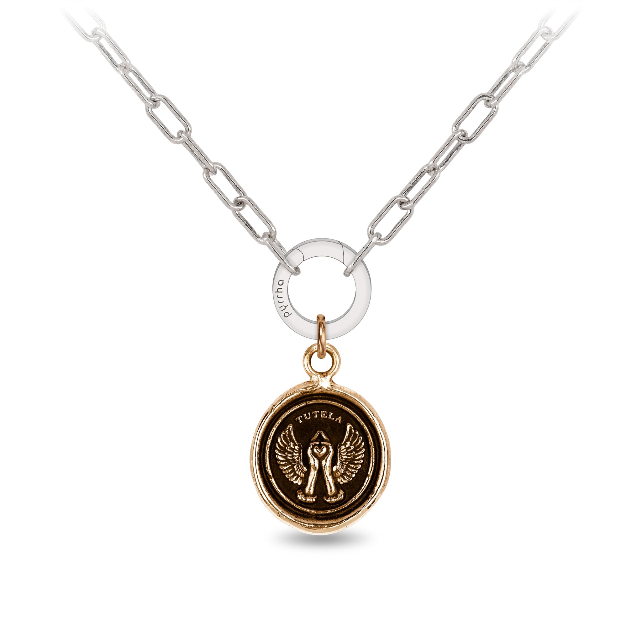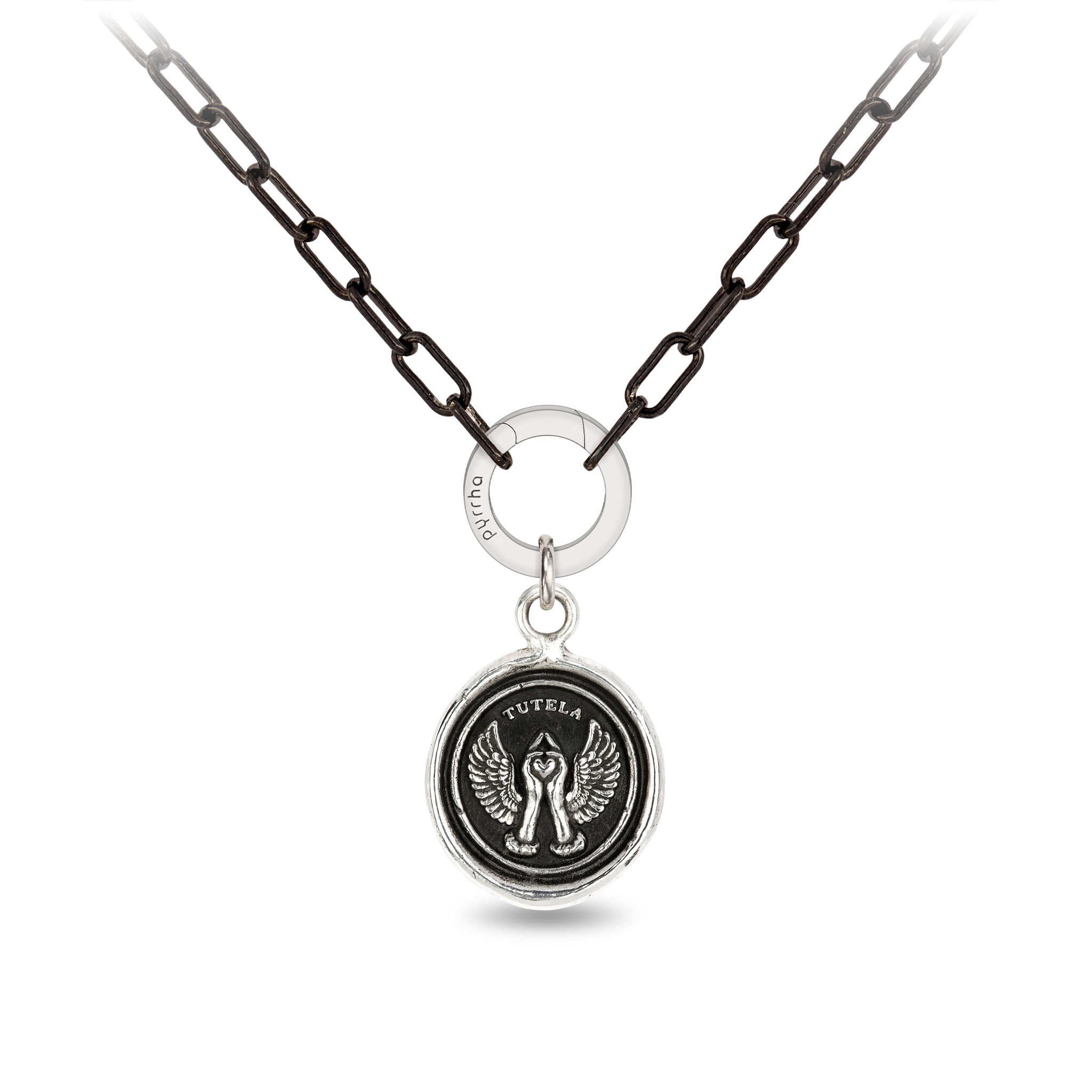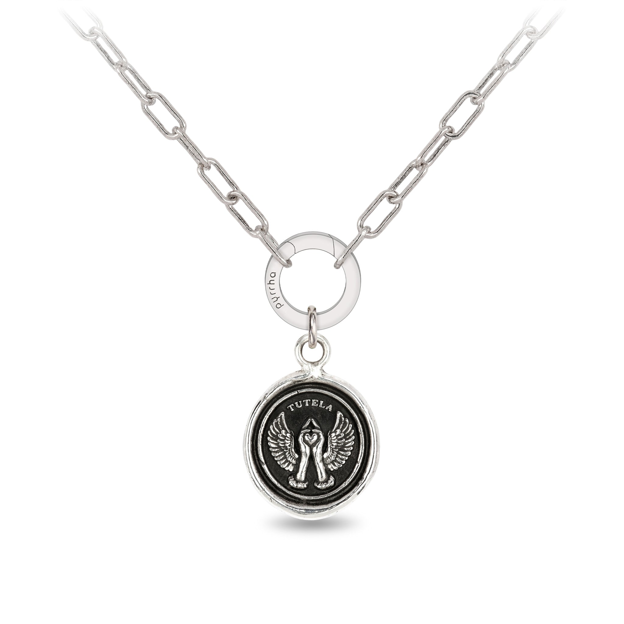 This talisman reads 'Tutela' in Latin, meaning 'Protection.' The hands cradling a heart symbolize nurturing support, while the wings represent a protective embrace.
