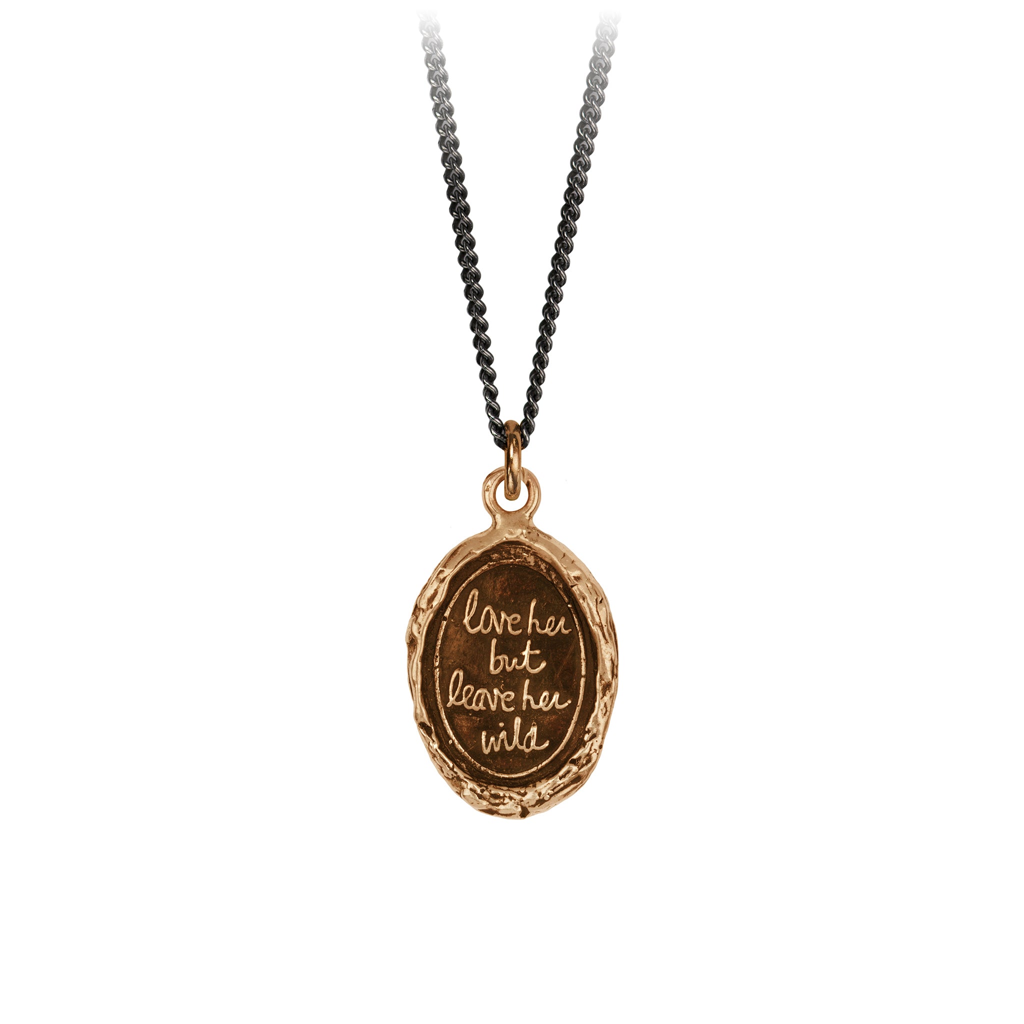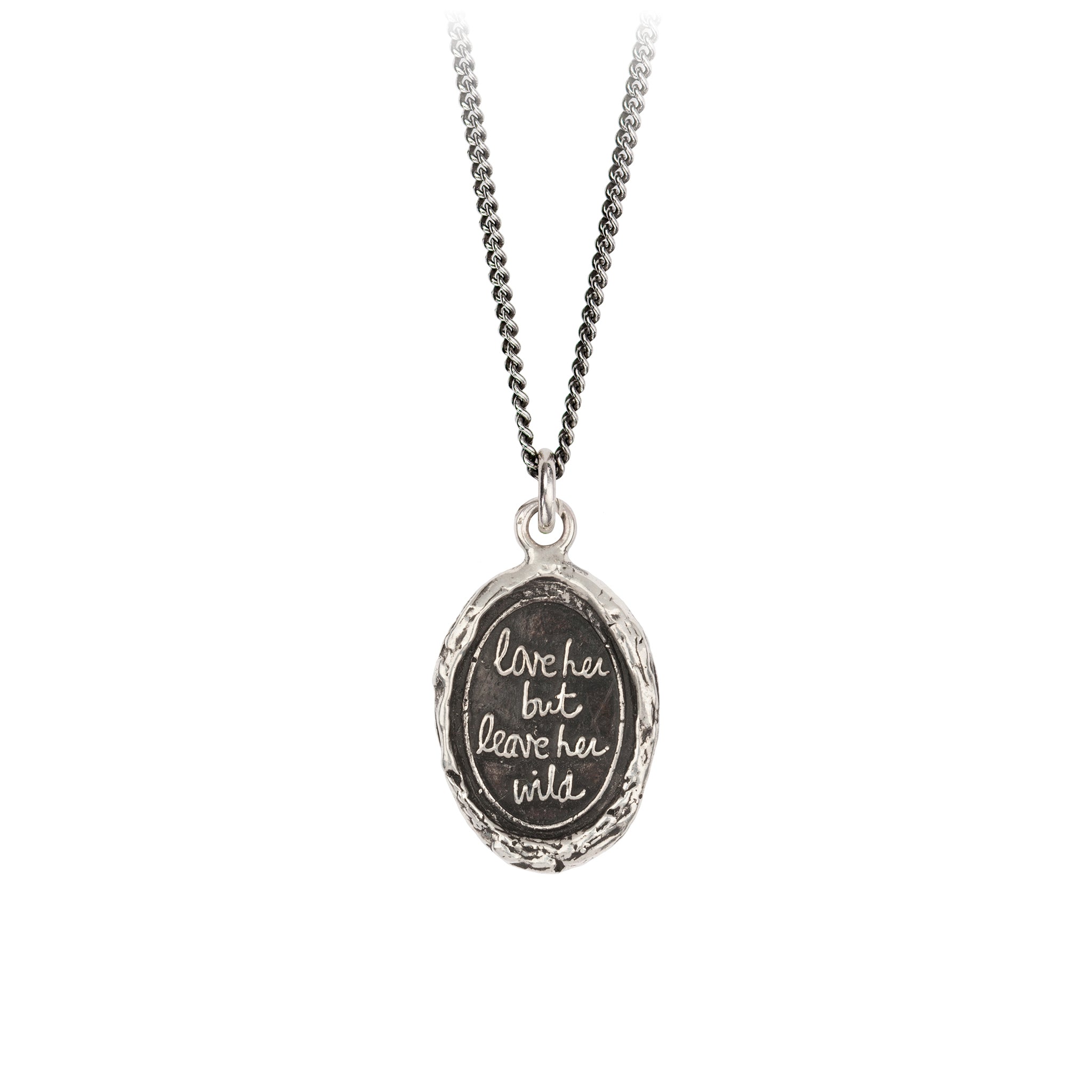 This talisman reads 'Love Her But Leave Her Wild' written by the poet Atticus as an appreciation of the irrepressible power of the female spirit. It is designed to be a symbol of strength, freedom and the untamed wild in all of us.