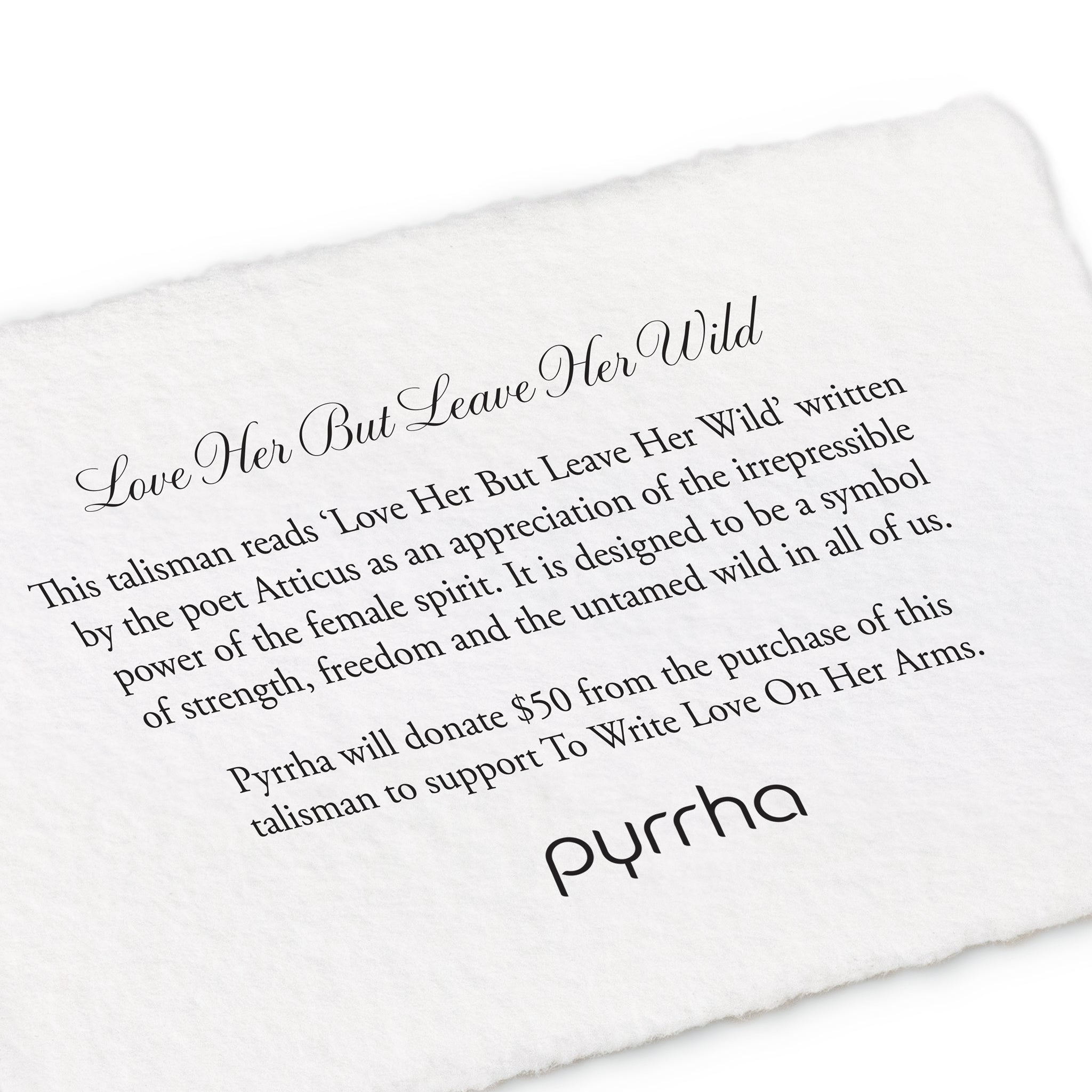 Pyrrha will donate $50 from the purchase of this talisman to support To Write Love On Her Arms.