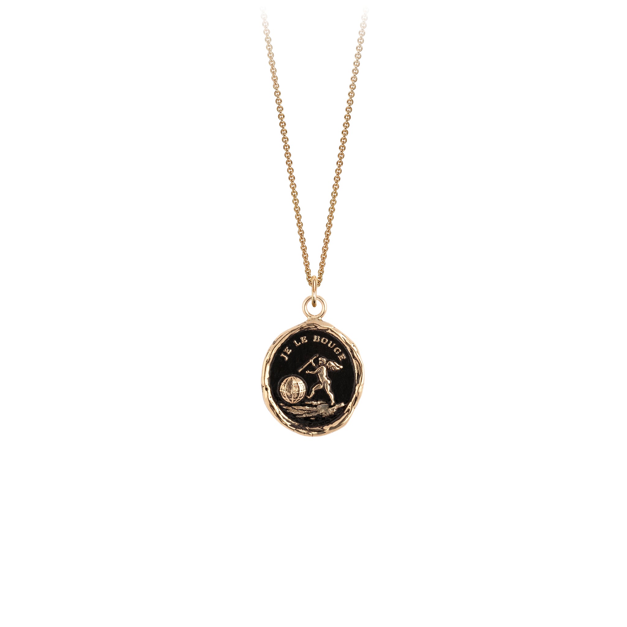 This talisman reads 'Je Le Bouge' in French, which means 'I Move It.' The image of a cherub moving the earth represents the unstoppable power of love.