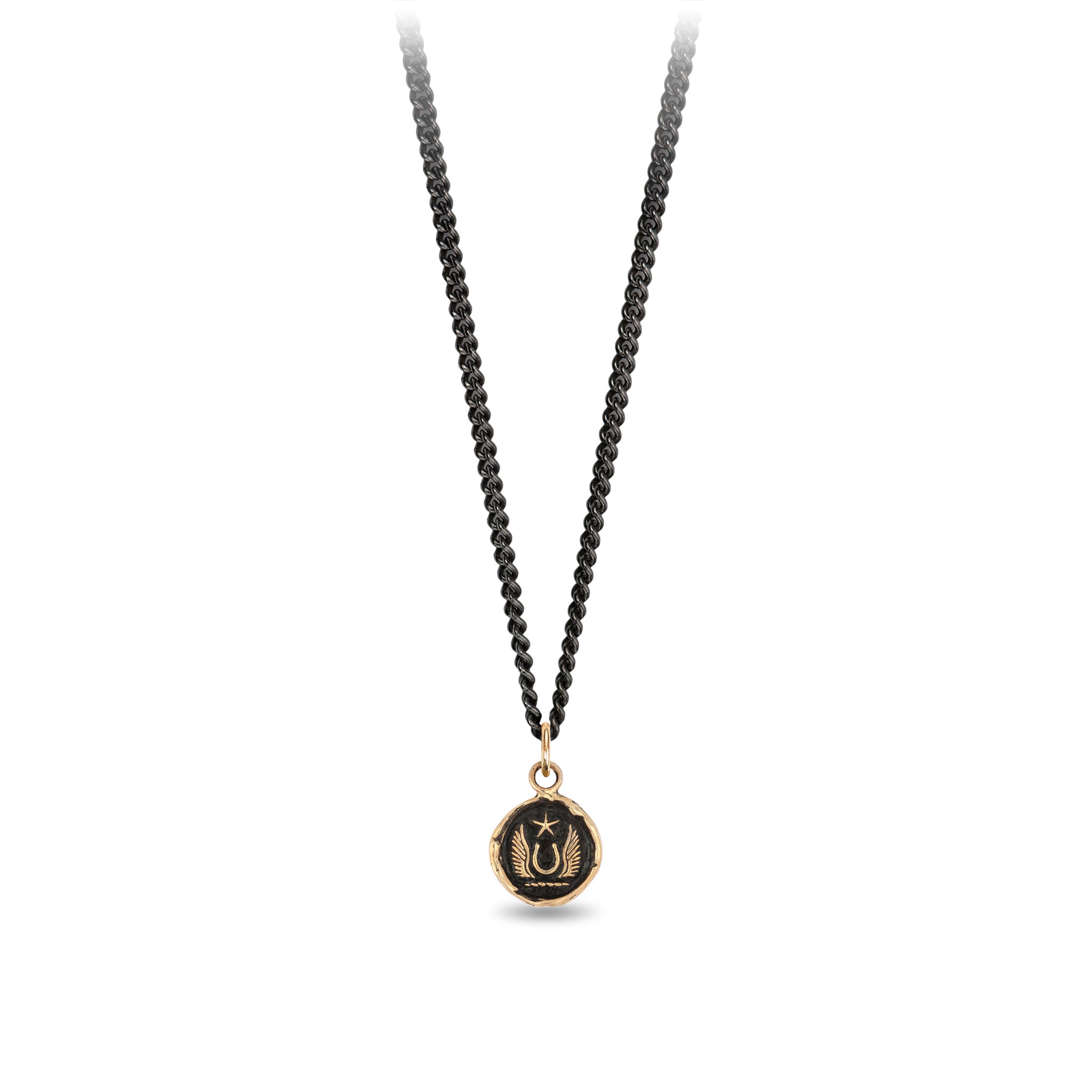 This talisman features a horseshoe flanked with wings representing luck and protection.