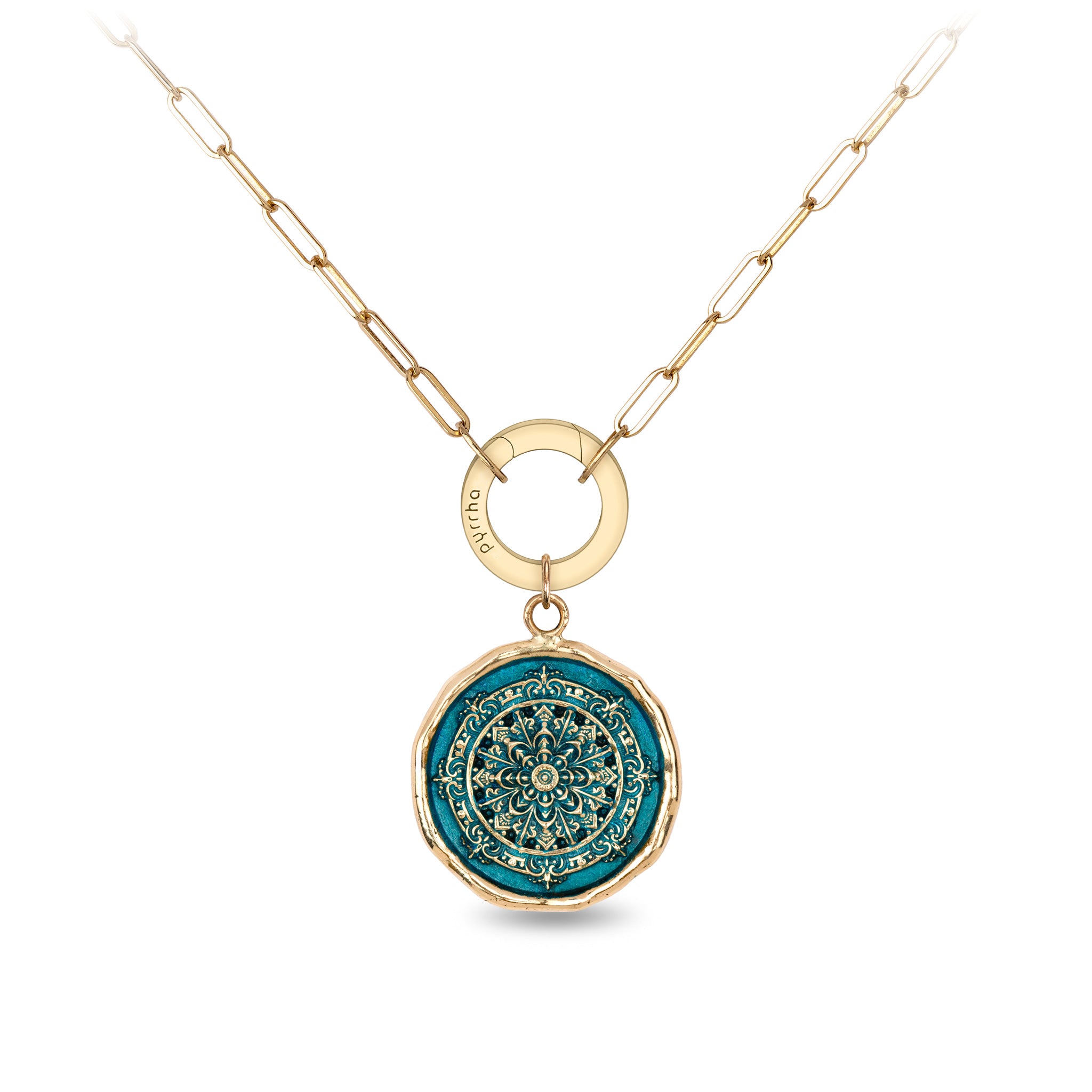 - 14k gold talisman affixed on a 14k gold paperclip chain