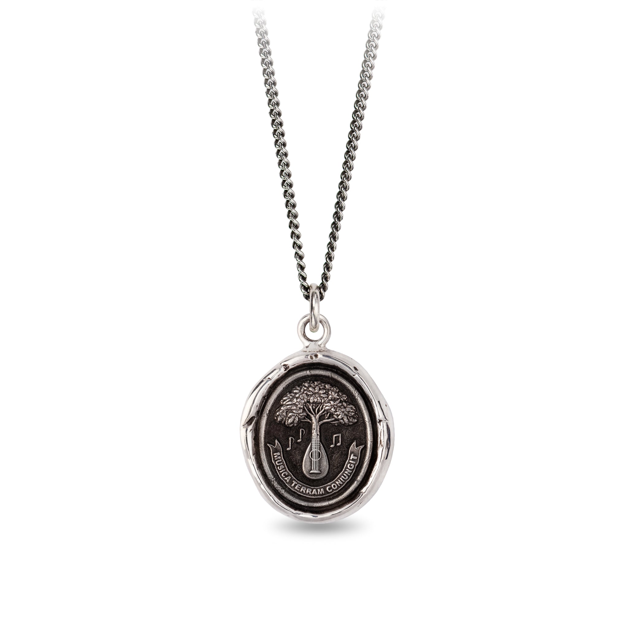 This talisman reads 'Musica Terram Coniungit' in Latin, meaning 'Music Unites the Earth.' The stringed instrument branching out into a tree is symbolic of the powerful connection between music and all living things.