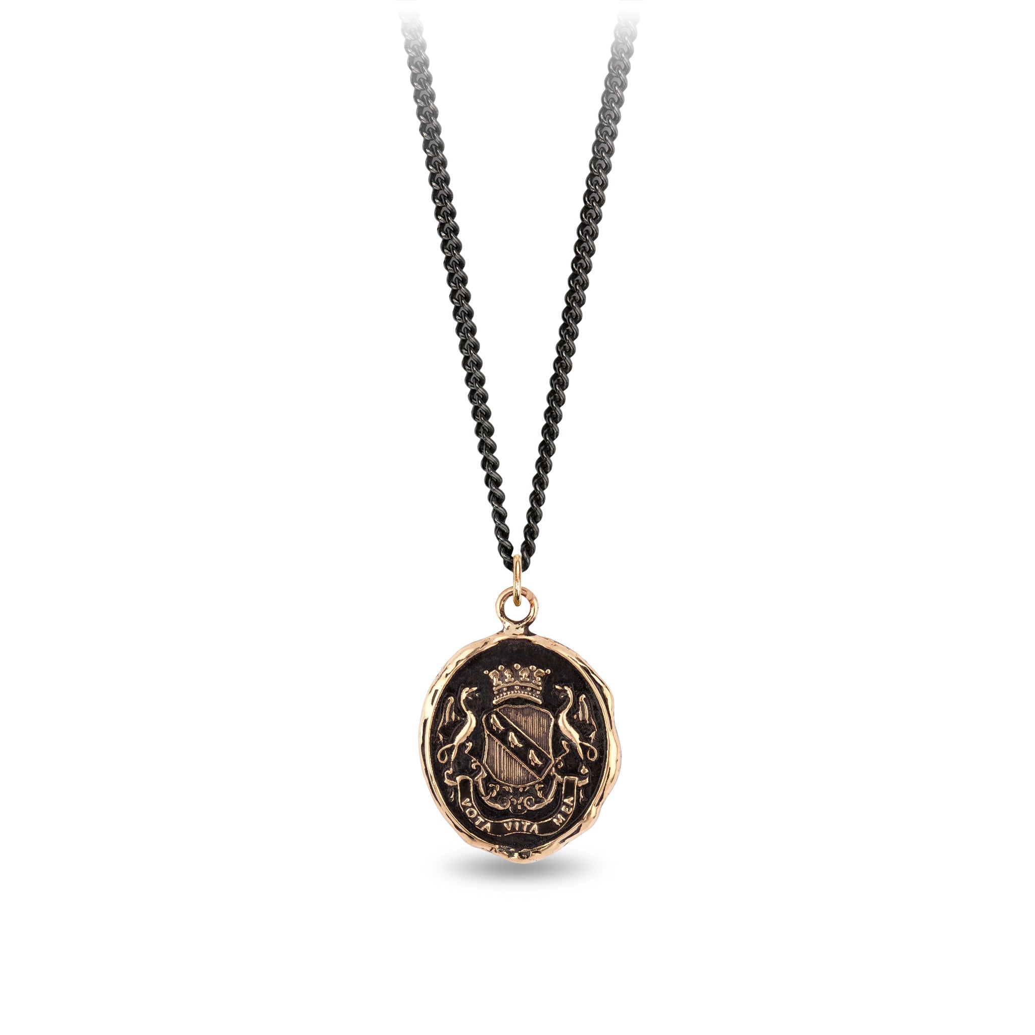 This talisman reads 'Vota Vita Mea' in Latin, meaning 'My Life is a Prayer'. The dragons are symbols of protection, acting as guardians who can help individuals find their way.