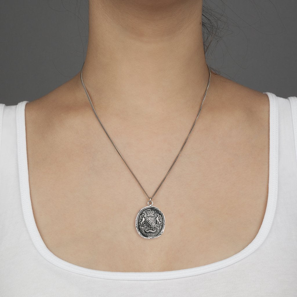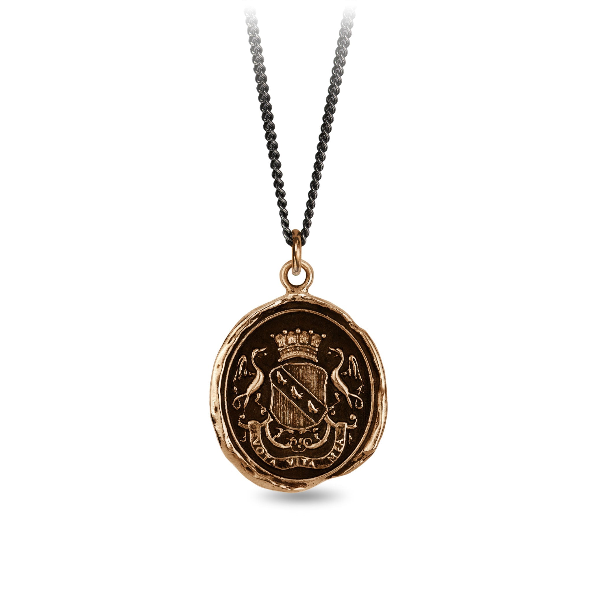 This talisman reads 'Vota Vita Mea' in Latin, meaning 'My Life is a Prayer.' The dragons are symbols of protection, acting as guardians who can help individuals find their way.