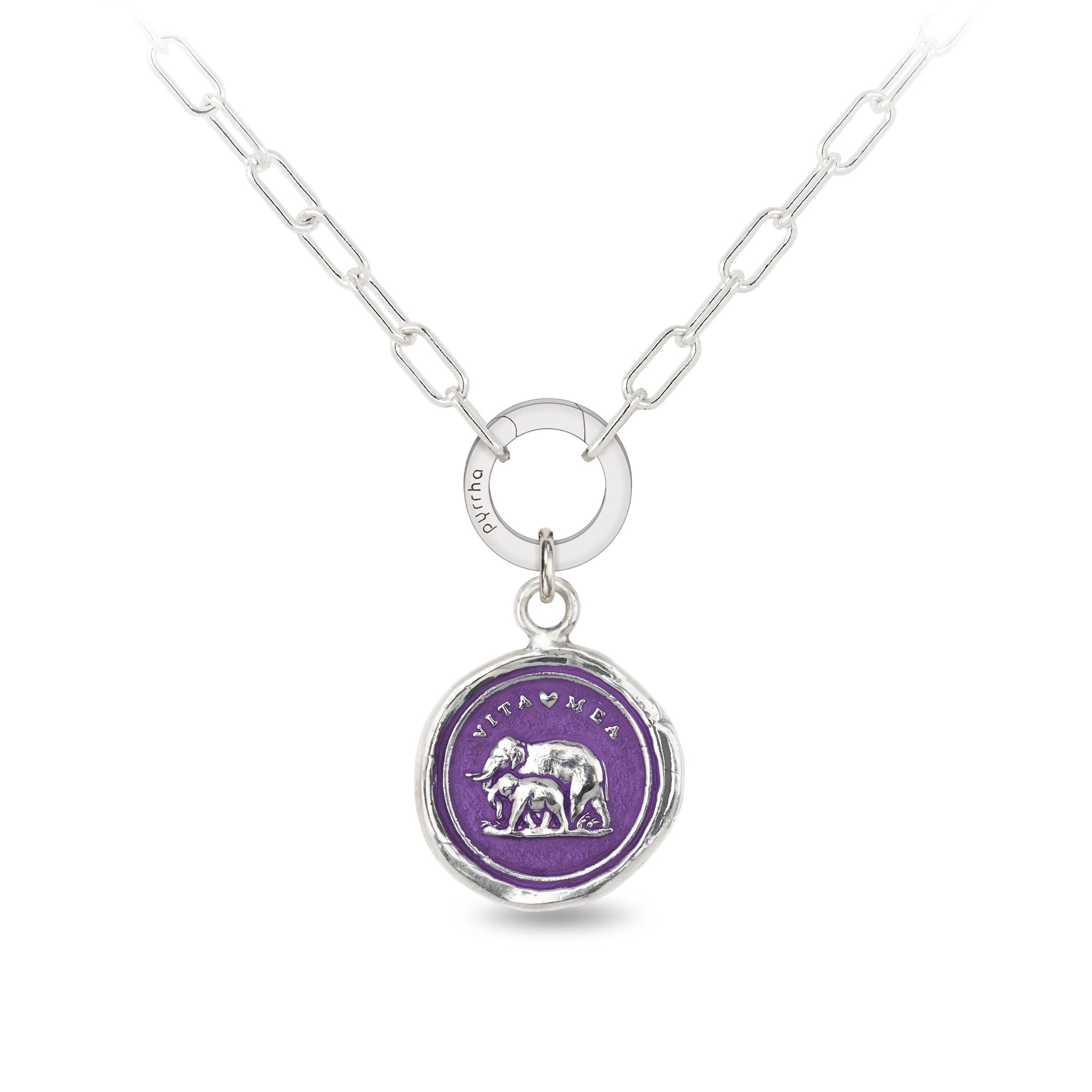 This talisman reads 'Vita Mea' in Latin, which means 'My Life.' The family-focused elephant depicted with its young is symbolic of the strength of the parent-child bond.