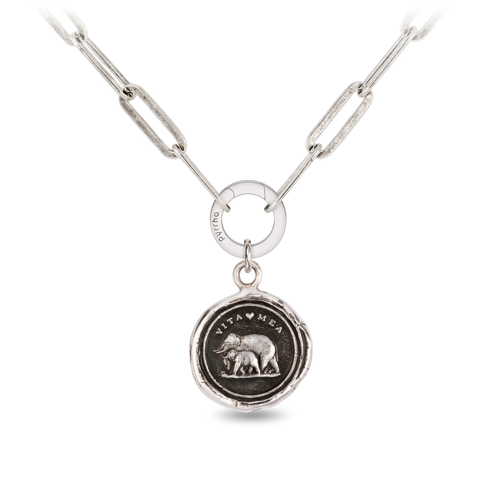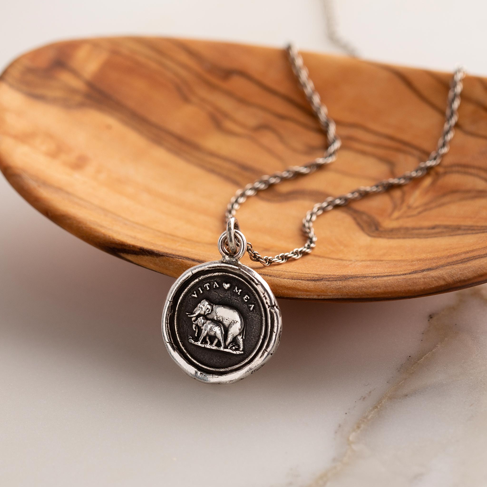 This talisman reads 'Vita Mea' in Latin, which means 'My Life.' The family-focused elephant depicted with its young is symbolic of the strength of the parent-child bond.