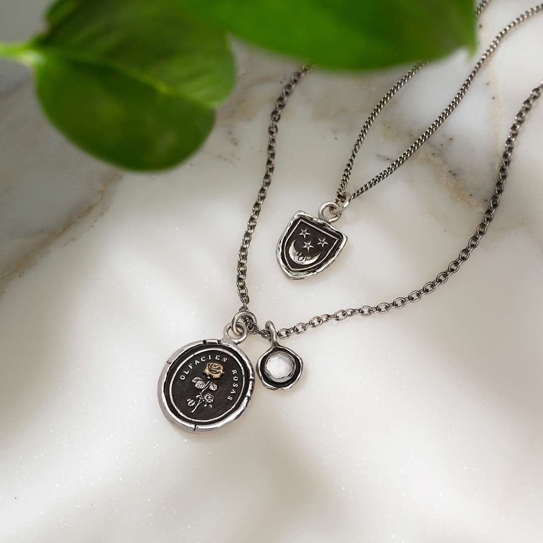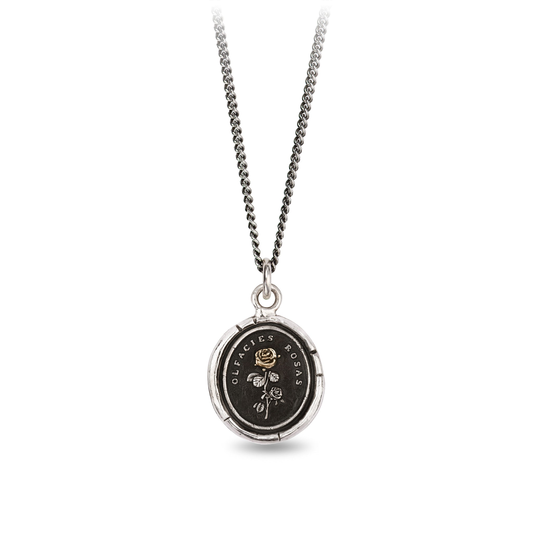 This talisman reads 'Olfacies Rosas' in Latin, which means 'Smell the Roses.' It is a reminder to slow down and take time to appreciate the important daily moments that bring us joy.