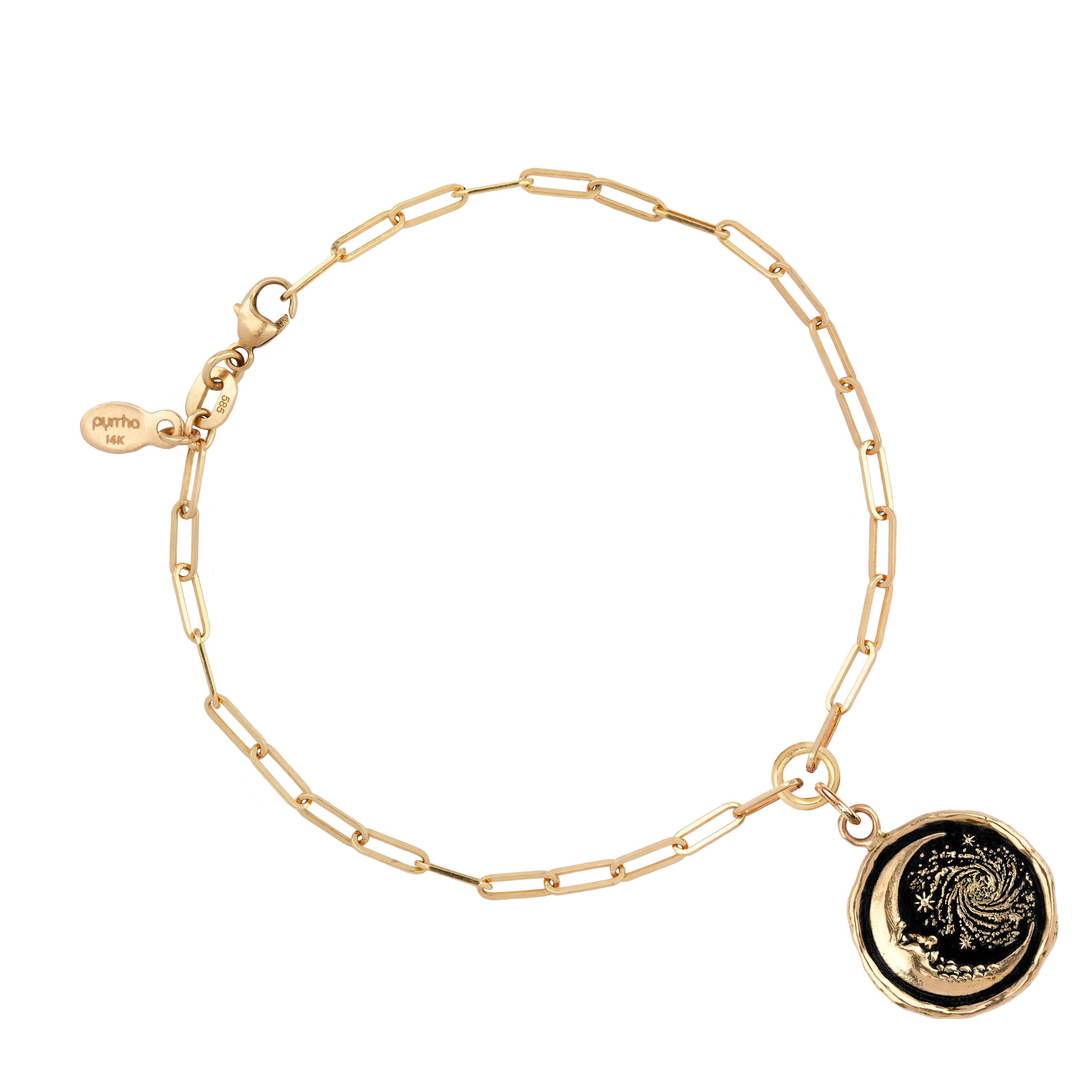 - 14k gold talisman affixed on a 14k gold paperclip chain