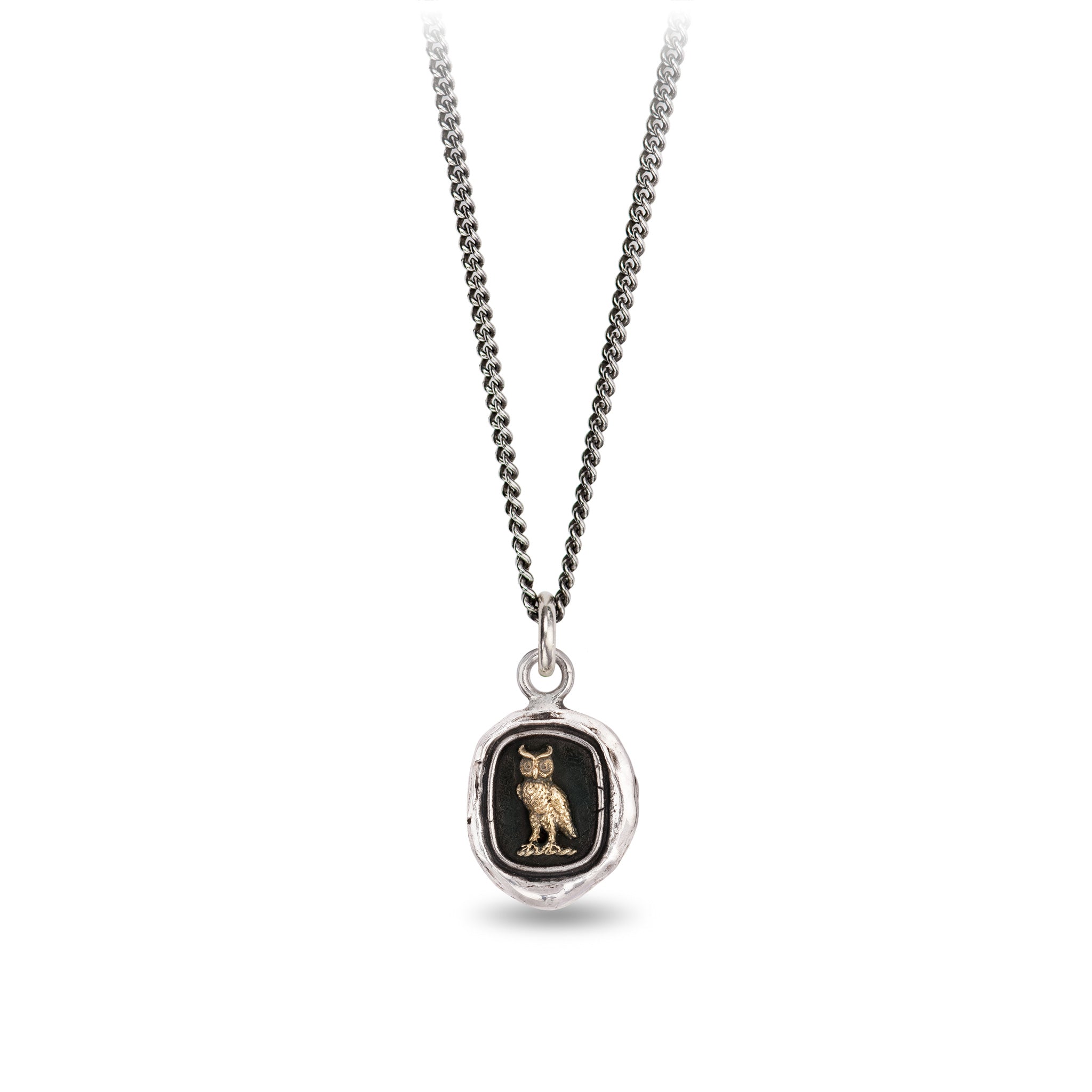 The great horned owl is a warrior bird representing strength, courage, and wisdom. Depicted facing forward on this talisman, the owl vigilantly watches over loved ones.