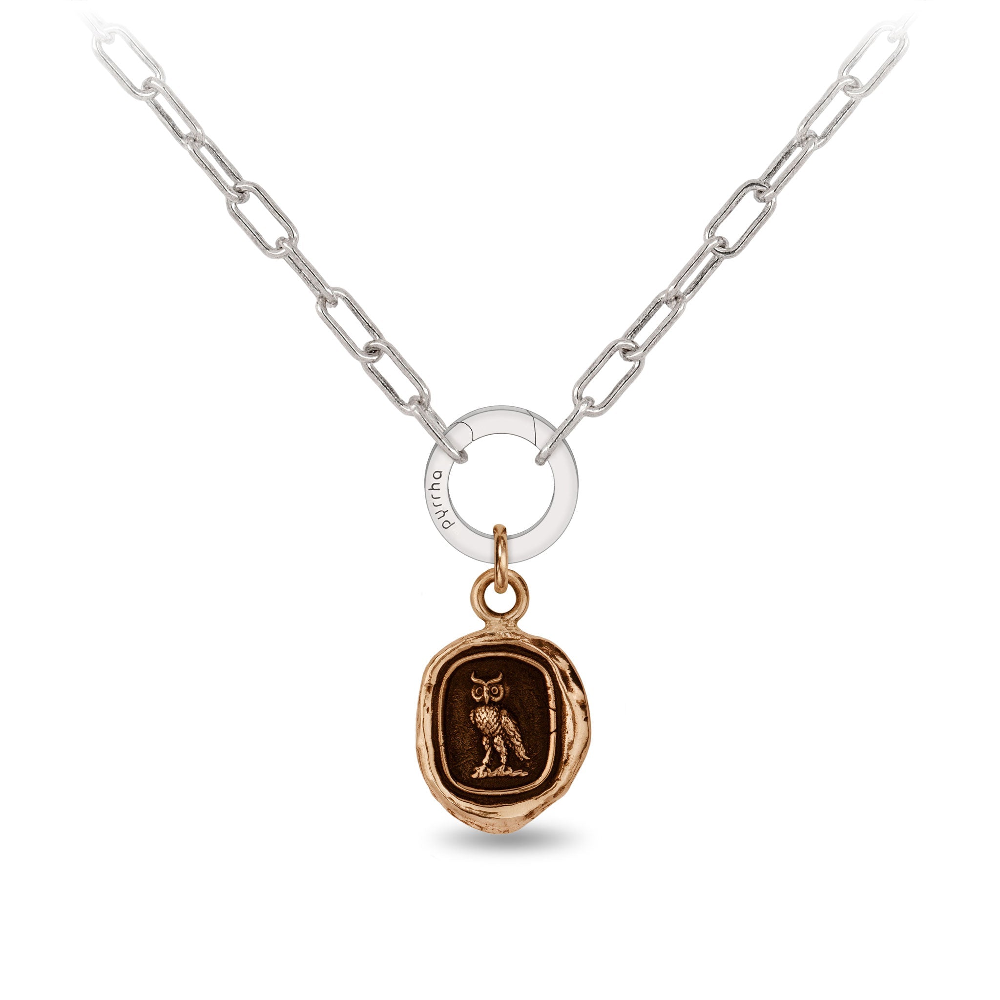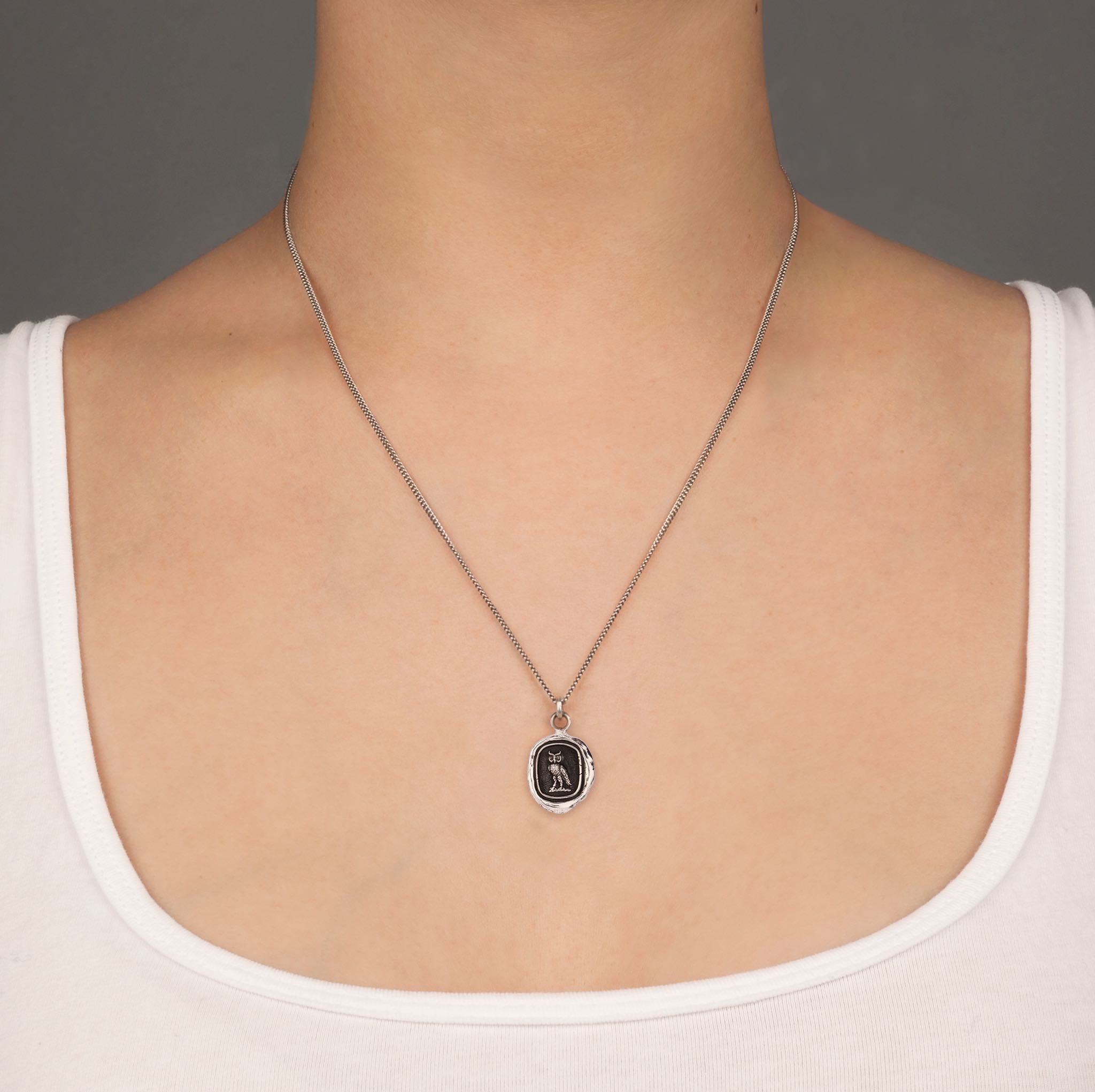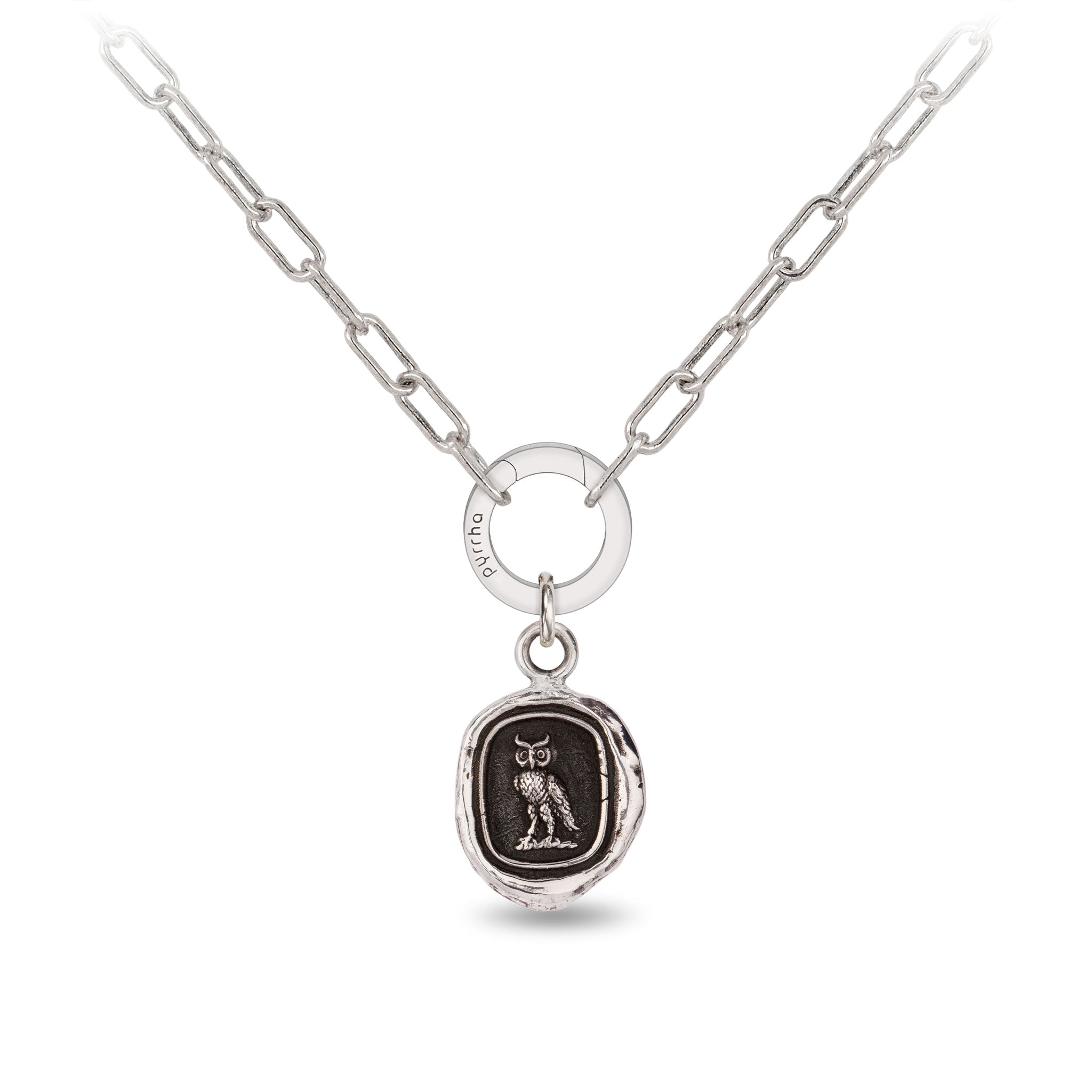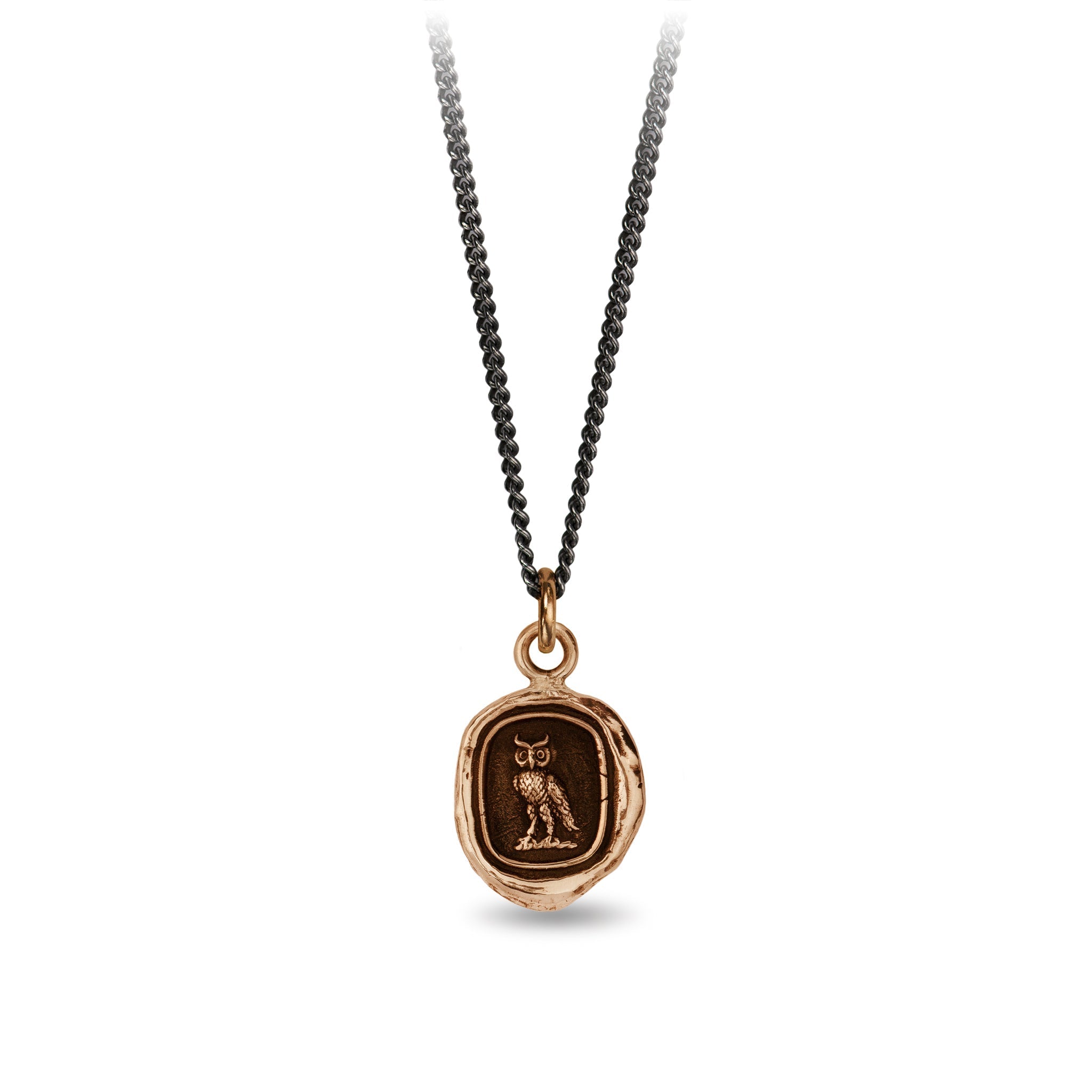 The great horned owl is a warrior bird representing strength, courage, and wisdom. Depicted facing forward on this talisman, the owl vigilantly watches over loved ones.