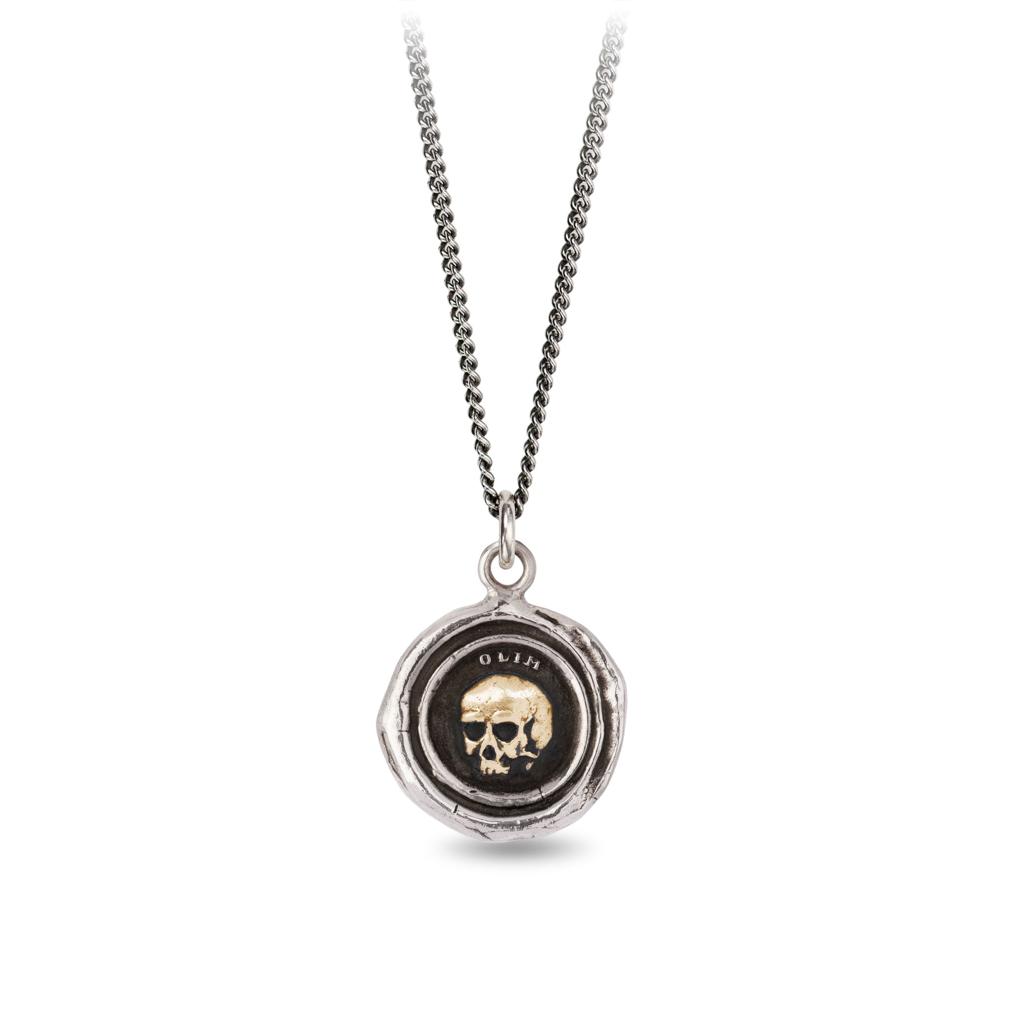 This talisman reads 'Olim' in Latin, which means 'Once.' The skull, a classic memento mori, is a reminder that life is fleeting.