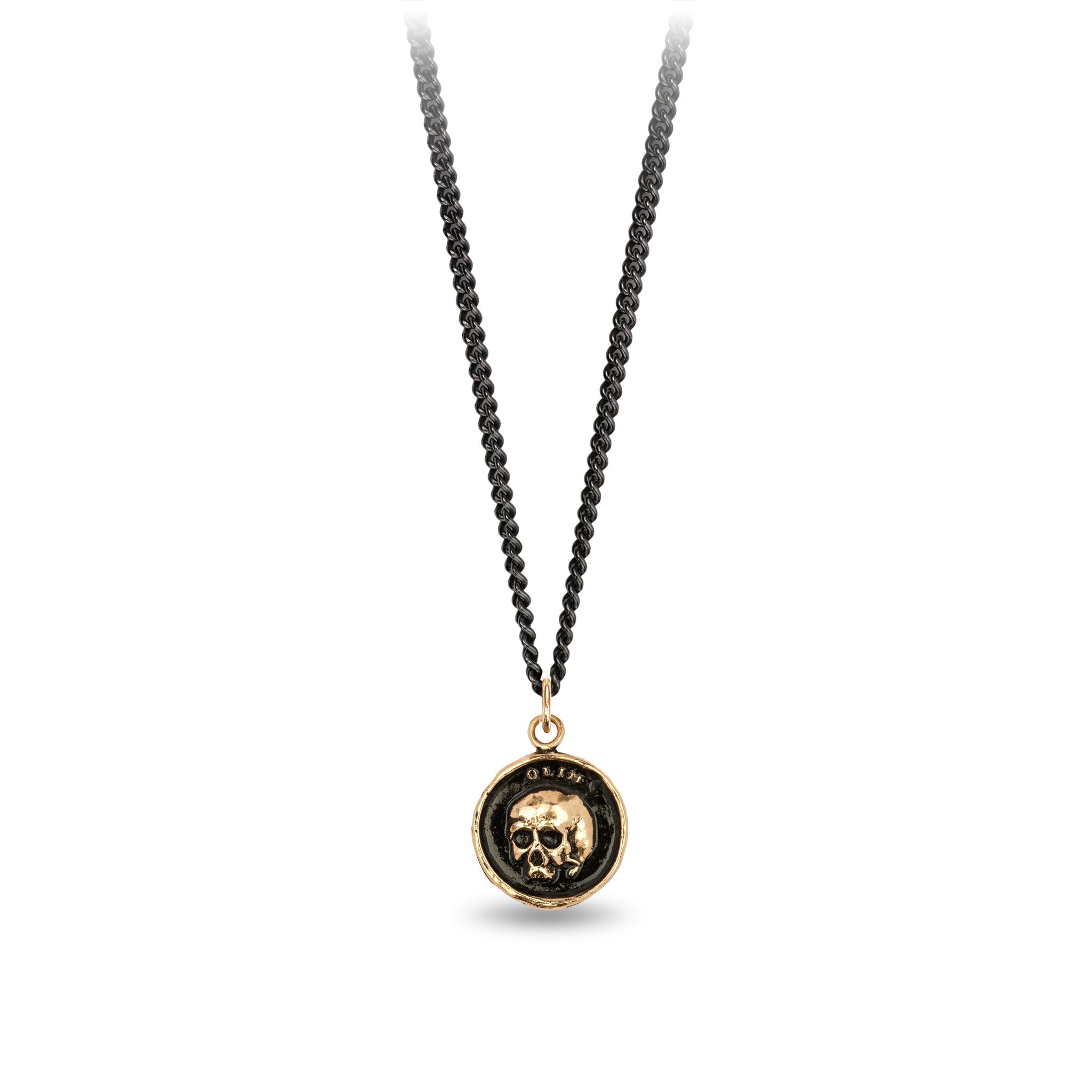 This talisman reads 'Olim' in Latin, which means 'Once.' The skull, a classic memento mori, is a reminder that life is fleeting.