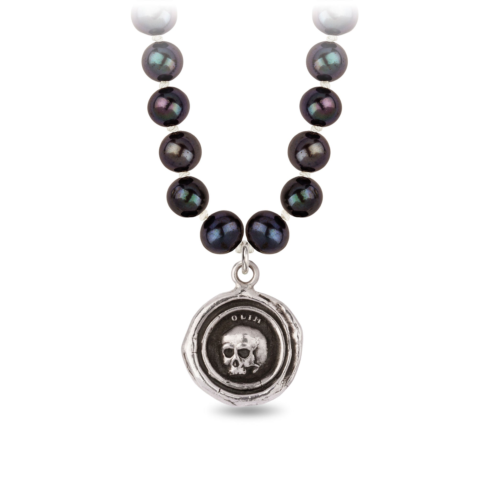 This talisman reads 'Olim' in Latin, which means 'Once.' The skull, a classic memento mori, is a reminder that life is fleeting.
